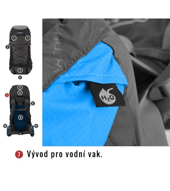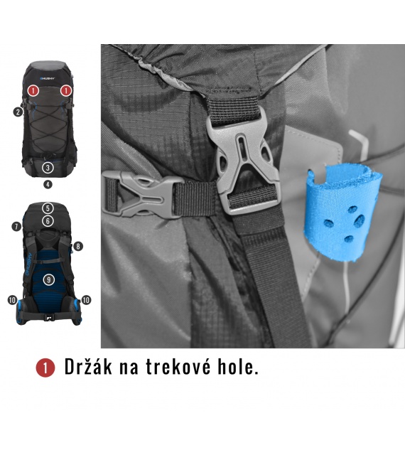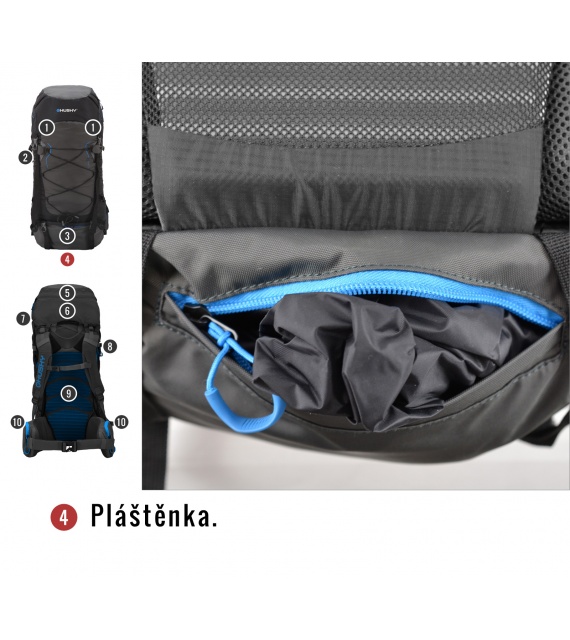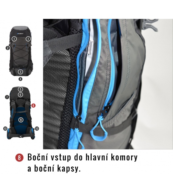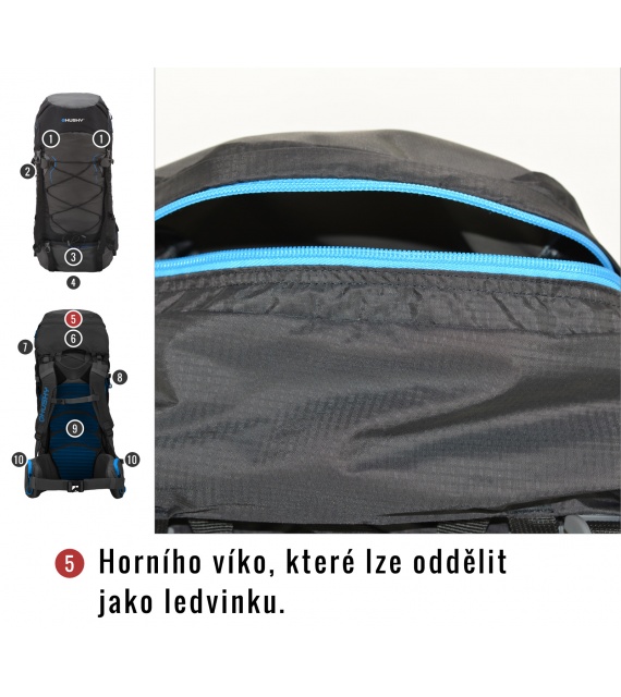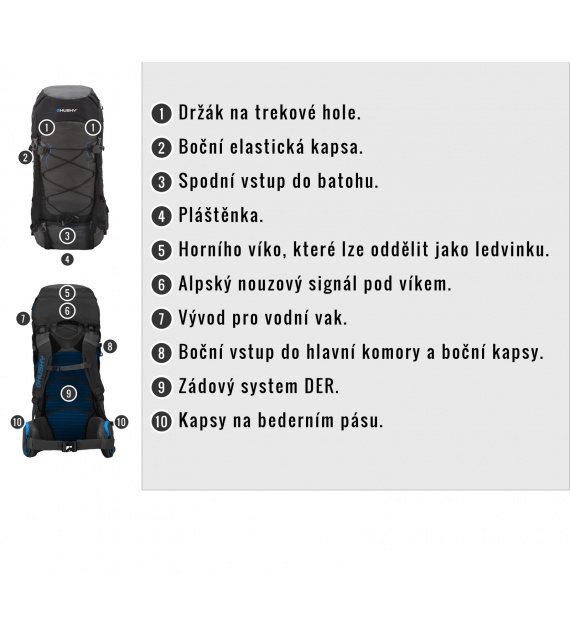 • Kenmerken van de Ribon rugzak: 2 hoofdcompartimenten met zijdelingse toegang tot de rugzak, elastisch trekkoord aan de voorkant, borstriem, compressieriem aan zij- en onderkant, bevestiging voor bijv. ski’s, in hoogte verstelbare bovenklep met vak, afneembare bovenklep die als heuptasje kan worden gebruikt, zijvakken met rits, elastische zijvakken, voorbereiding voor een waterzak, regenhoes, reflecterende elementen, fluitje.
