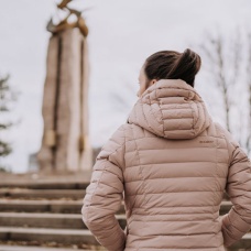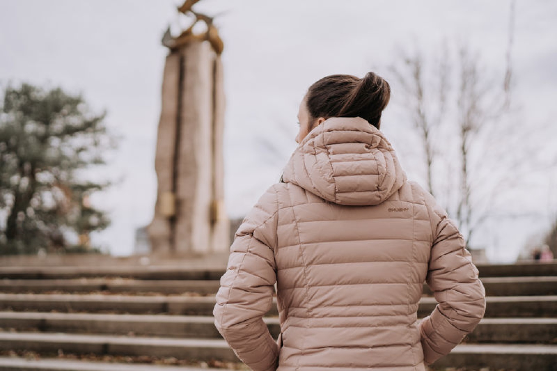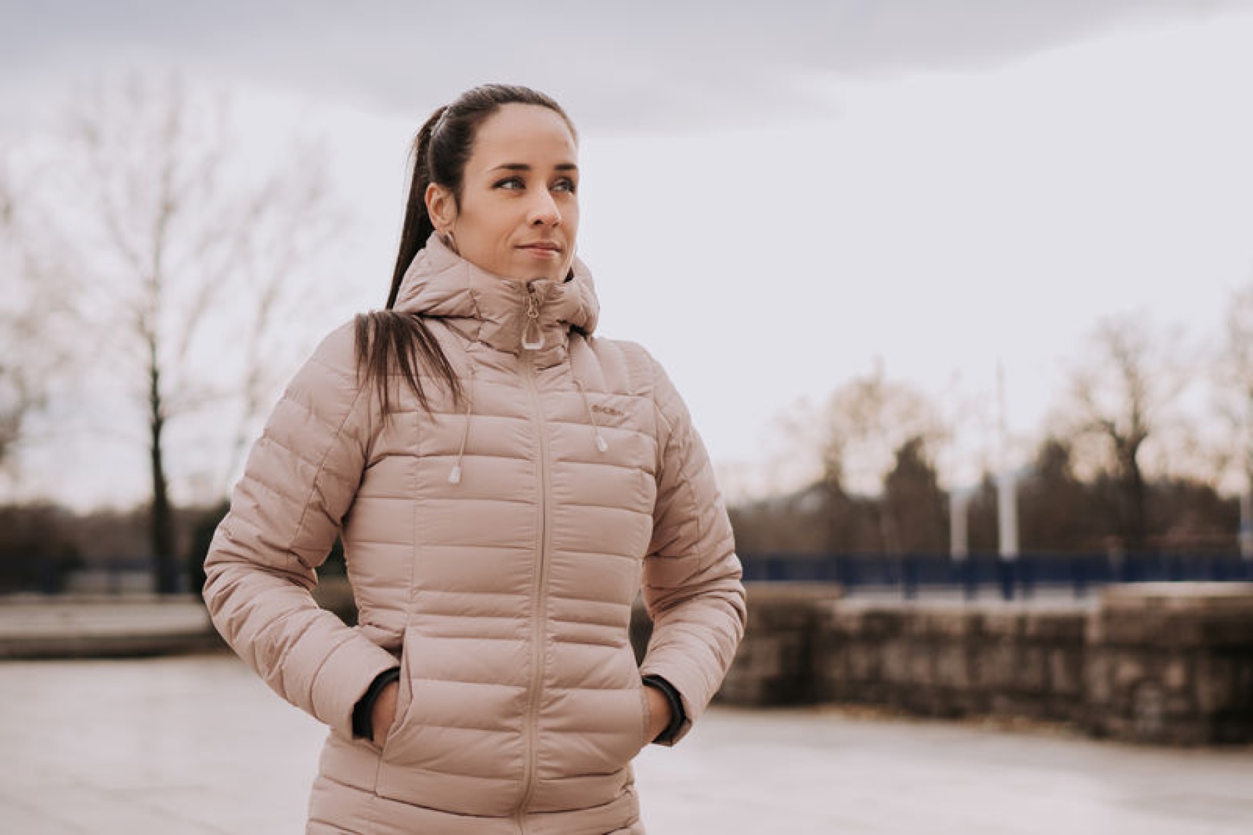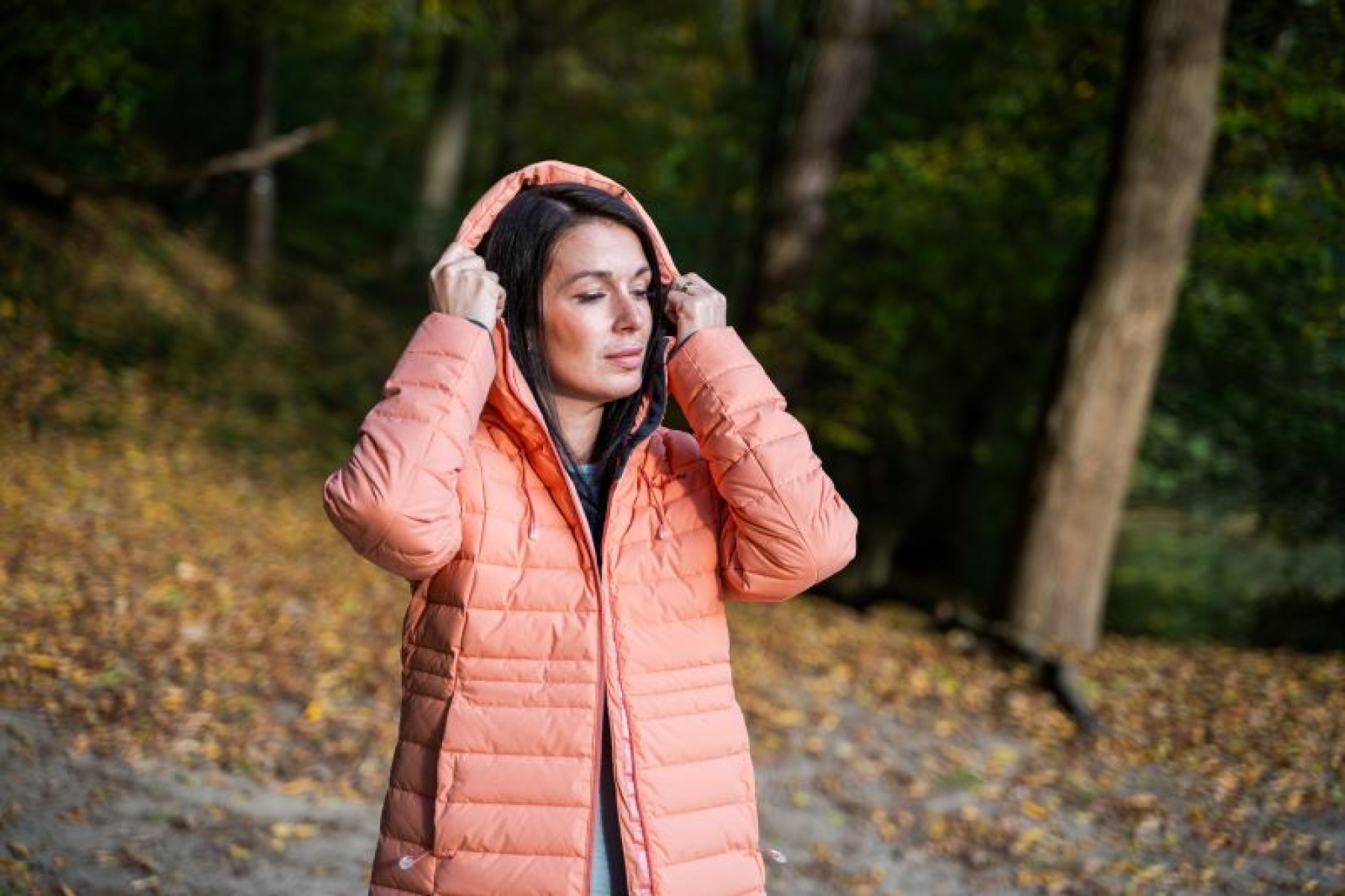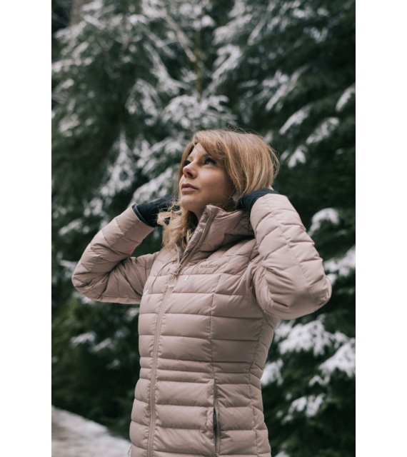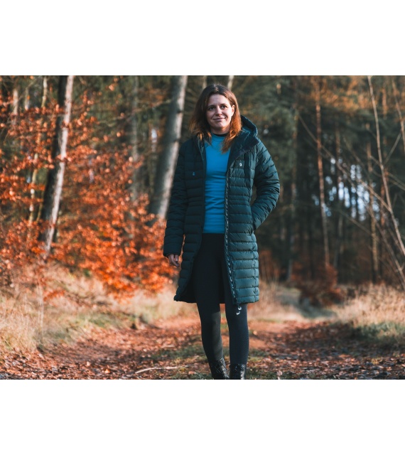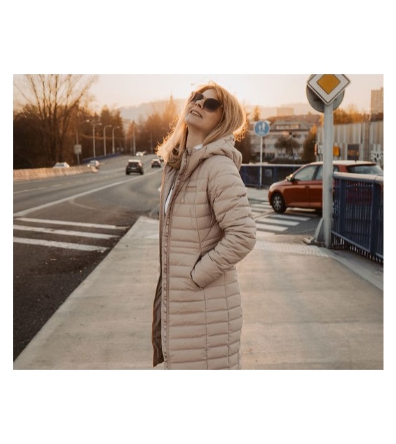 lange damesjas met eendendons vulling en waterdichte finish voor erg koude winterdagen.