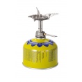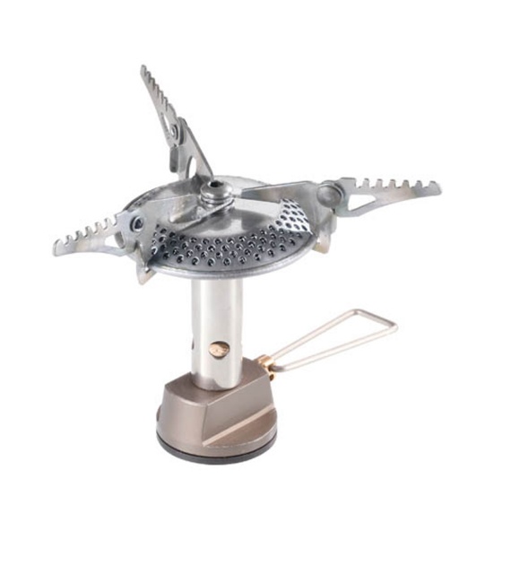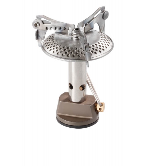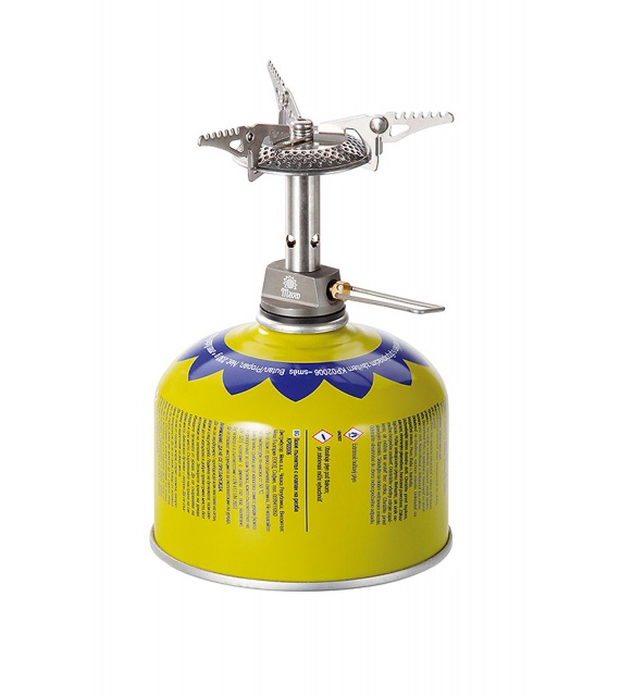 Het Meva Hiker reis kooktoestel met uitvouwbare armen maakt gebruik van gascartouches met ventiel en schroefdraad (KP02006 en KP02007).