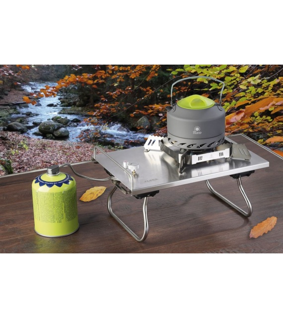 Draagbaar roestvrijstalen camping kooktoestel. Hoog brandervermogen 5 kW, piëzo-ontsteking. Dankzij de stevige poten is het kooktoestel bijzonder stabiel. Bediening en ontsteking van het kooktoestel vanaf de bovenkant, voor handig gebruik in de kofferbak van auto's. Inclusief praktische transporthoes van textiel.