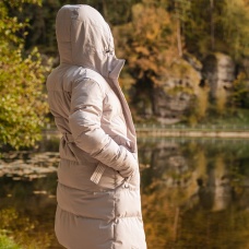 Comfortabele lange damesjas met capuchon en waterdicht membraan voor allerlei buitenactiviteiten in de stad en in de natuur.