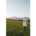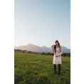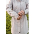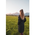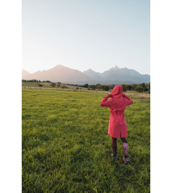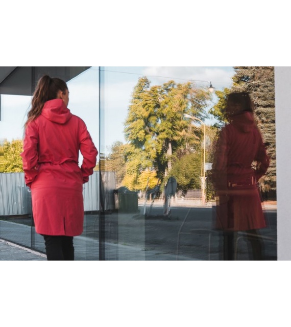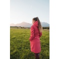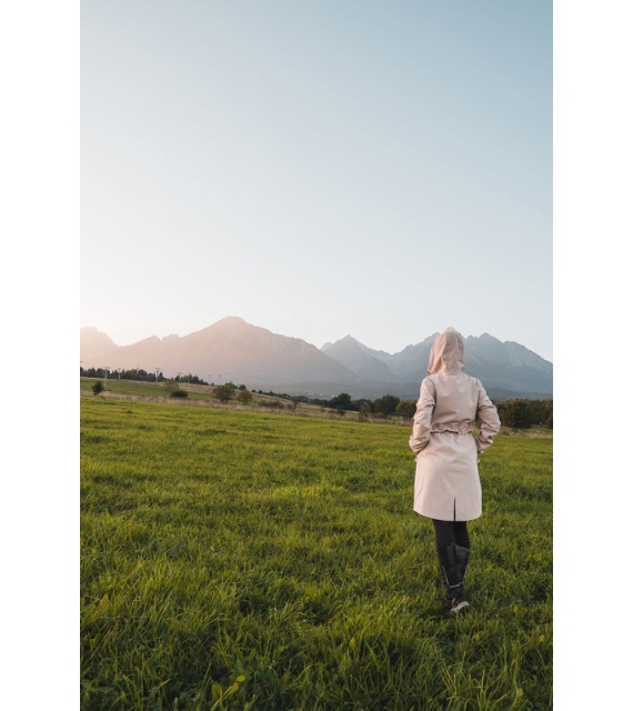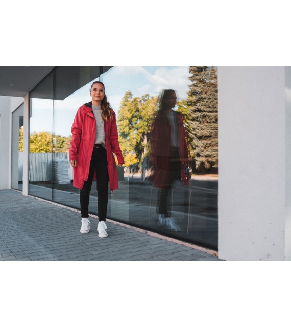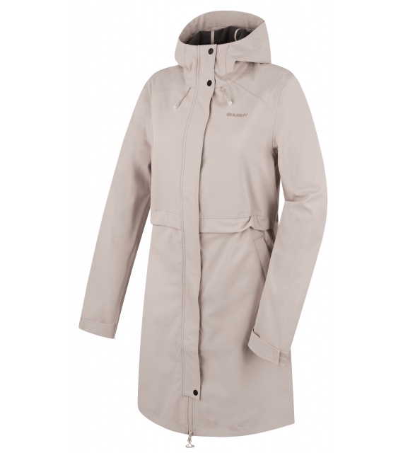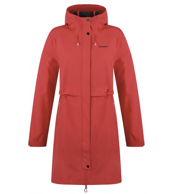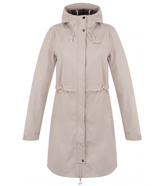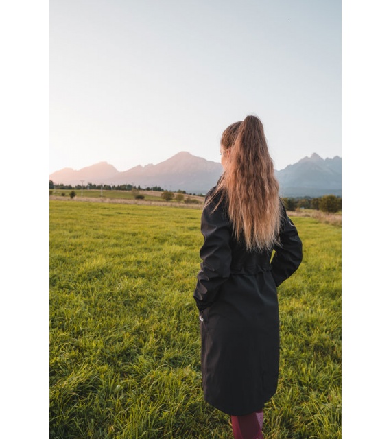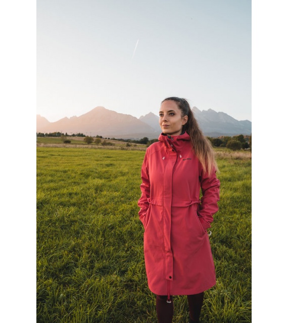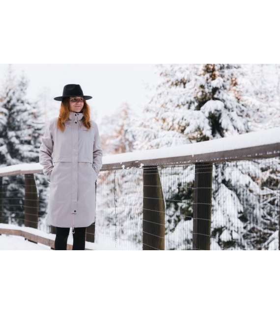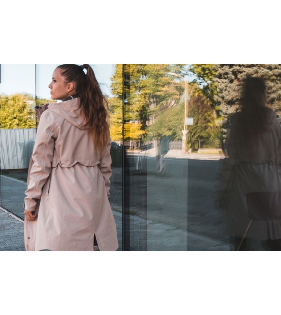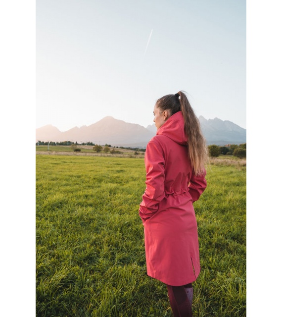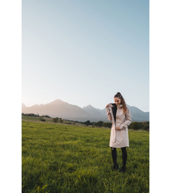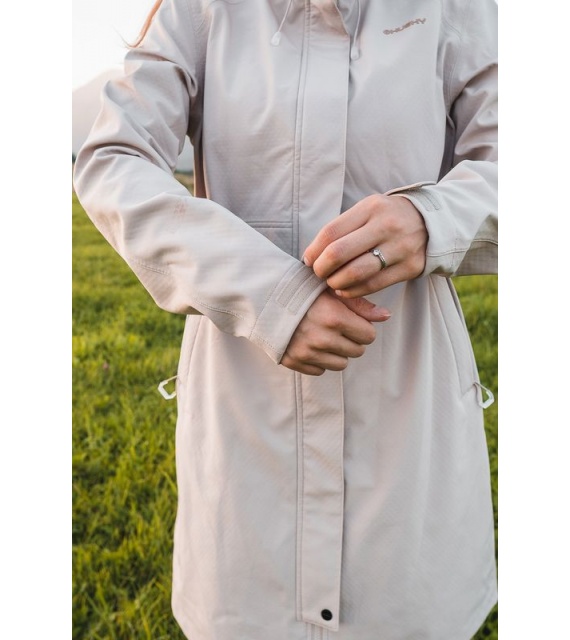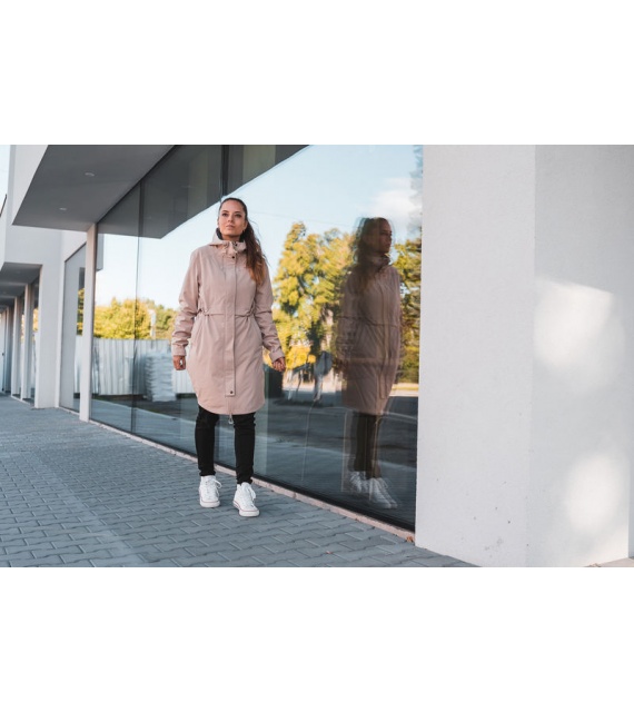 Multifunctionele lange damesjas met trekkoord in de taille voor outdooractiviteiten en wandeltochten in alle seizoenen.