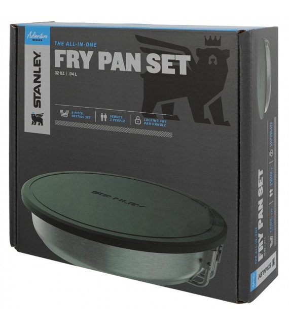 Adventure series set met STANLEY koekenpan - alles wat je nodig hebt voor een snelle maaltijd tijdens je tochten. De set bestaat uit een roestvrijstalen koekenpan, snijplank, spatel, twee lepels, twee borden en een siliconen pannenlap!