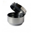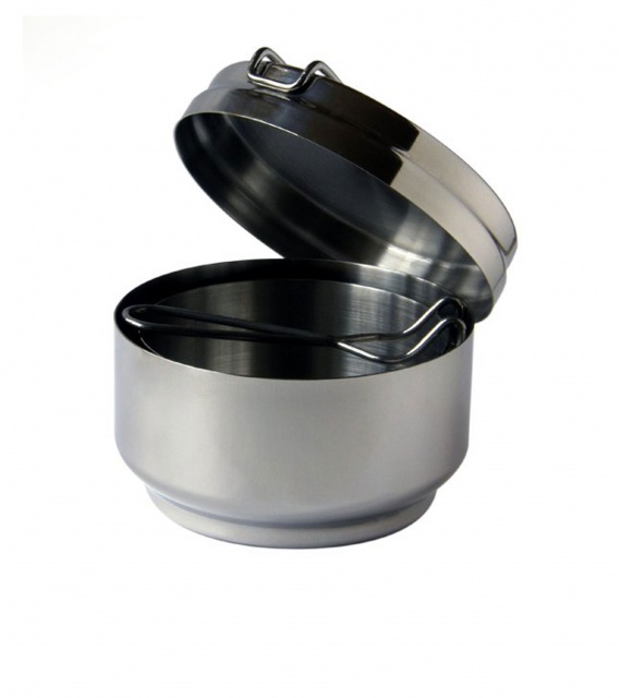 Klassiek driedelig roestvrijstalen eetbakje/pannenset - twee bakjes/pannen en een deksel of koekenpan, inklapbare handgrepen. Klassieke, beproefde pannen van hoogwaardig 18/10 CrNi roestvrij staal.