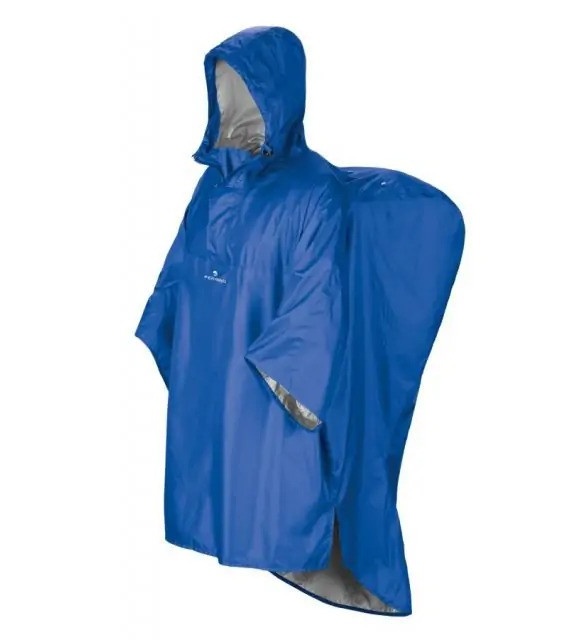 Waterdichte nylon poncho in twee maten met ruimte voor een rugzak. Getapete naden met een waterkolom van 2000 mm. Capuchon met "One touch"-verstelling met één hand. Opbergzak.
