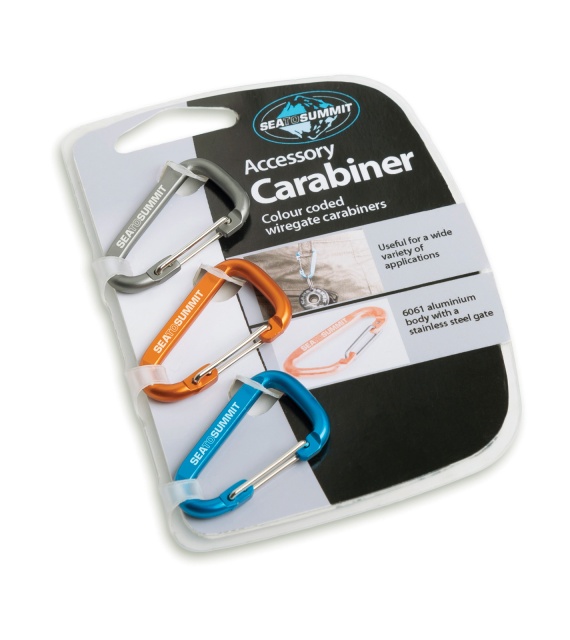 Kleine karabijnhaken geschikt om spullen aan een rugzak te hangen of voor sleutels. Karabijnhaken zijn erg handig om allerlei dingen te verbinden, dingen aan een rugzak te hangen of een lamp in een tent op te hangen, voor sleutels, of bijvoorbeeld voor het verbinden van scheerlijnen aan Sea to Summit poncho's bij het bouwen van een tarp.