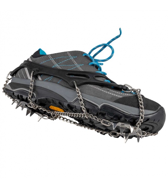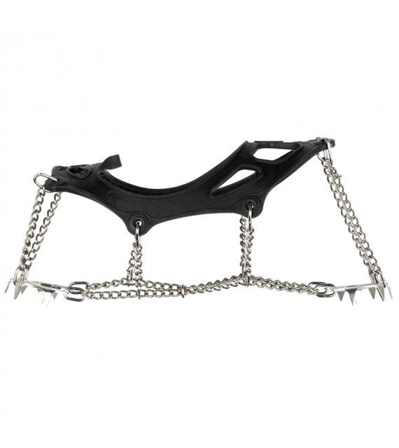 Versterkte constructie van lichtgewicht schoenkettingen met stalen spikes die met kettingen met elkaar zijn verbonden voor extra stevigheid. Schoenkettingen zijn bedoeld voor wandelen en hardlopen op glad en beijzeld terrein. De elastische band is flexibel, zelfs bij extreme kou. Geschikt voor sport- en vrijetijdsschoenen. Niet bedoeld om mee te klimmen. Geleverd in een praktische verpakking met rits. Dit model is geschikt voor licht terrein (verharde wegen, bevroren sneeuw).