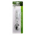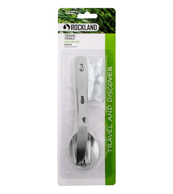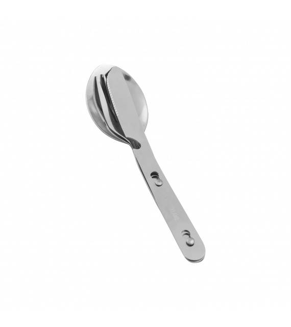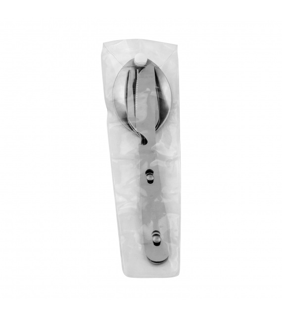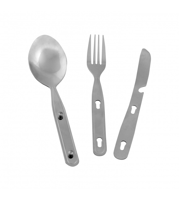 Driedelige camping bestekset met vier functies. Lepel, vork, mes/flesopener, gemaakt van roestvrij staal.