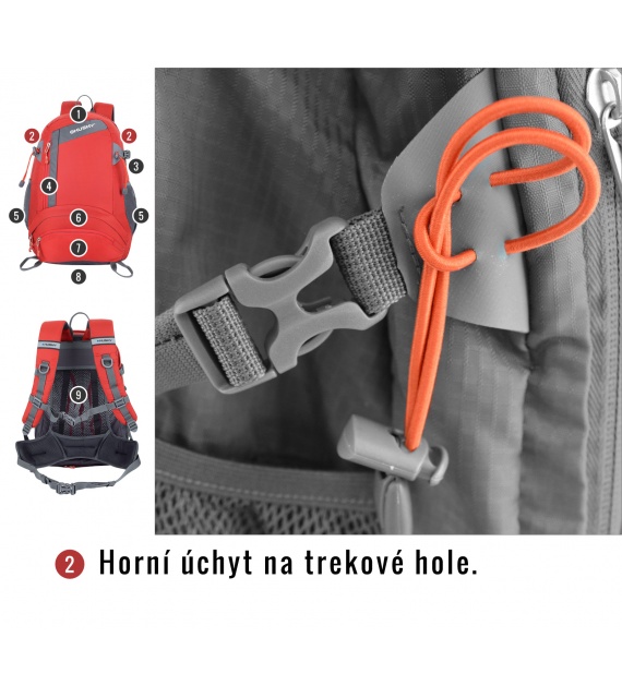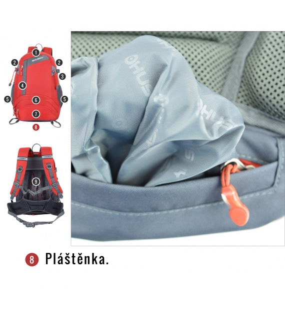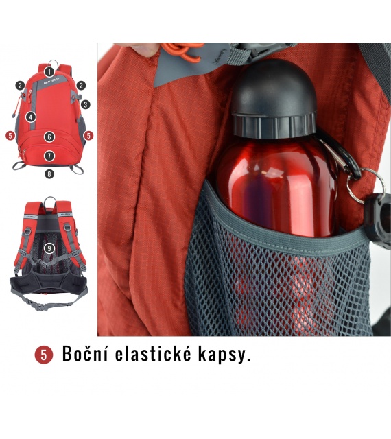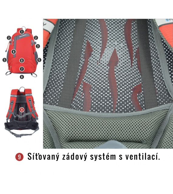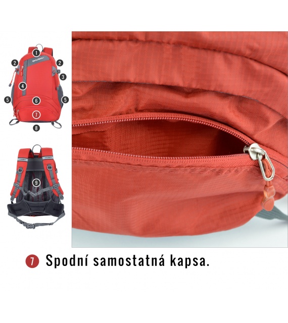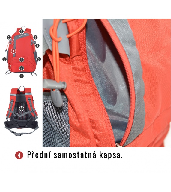 Kenmerken van de Stingy New rugzak: NBS-rugsysteem met dural versteviging, ademende en anatomisch gevormde gewatteerde schouder- en heupbanden, 2 hoofdcompartimenten en een voorvak (één compartiment kan in twee delen worden verdeeld), aparte opening aan de onderkant van de rugzak, elastische zijvakken, compressieriemen aan de zijkant, borst- en heupband, lussen voor bijv. trekkingstokken, regenhoes, reflecterende elementen.