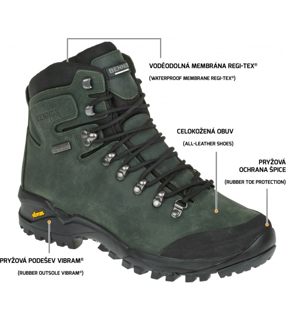 De hoge, volledig leren uniseks Terenno High trekkingschoenen van het merk BENNON zijn de juiste keuze als je van zware bergwandelingen houdt. Dankzij de gebruikte kwaliteitsonderdelen en materialen zijn deze schoenen stabiel op elk terrein en bestand tegen ongunstige weersomstandigheden, zodat je voeten droog en veilig blijven.