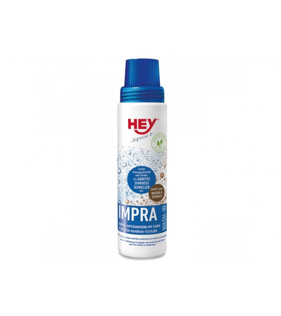 HEY SPORT® Impra Wash-In is een impregnatie die tijdens het wassen aan het wasgoed wordt toegevoegd en zorgt voor volledige bescherming tegen water terwijl het ademend vermogen behouden blijft. Vooral geschikt voor textiel met membranen en voor textiel met nanotechnologieën. Perfecte vezelbescherming. HEY SPORT® Impra Wash-In impregneert alle stoffen van natuurlijke en synthetische vezels. Behoudt het actief ademend vermogen en frisse kleuren.