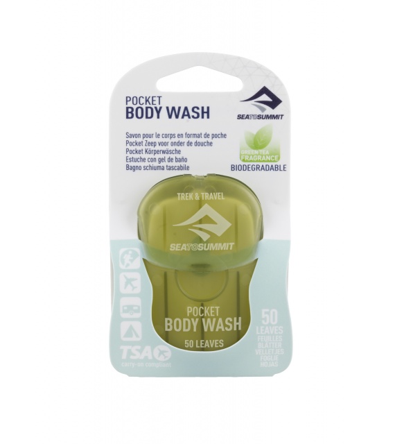 Lichaamszeep in de vorm van vijftig oplosbare blaadjes in een pocketverpakking die comfortabel in elke handbagage, rugzak of broekzak past.